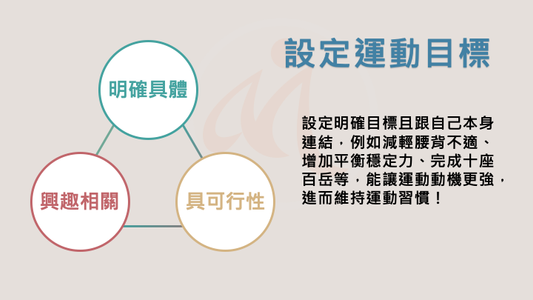 一、 運動的目標:不像年輕人要追求身材線條,熟齡族群最希望找回年輕時的靈活矯健,子女們也是期待父母能透過運動改善身體健康,但是要有效果就要先定義甚麼是”健康”,也就是把目標需求先設定清楚,才能對症下藥的解決問題,並透過正確適合的運動改善身體健康。舉例來說,籠統的目標會像是”體力強化、動作更靈活、身體更健康”等等,是很不確切的方向;建議需要更加明確的目標:腰痛舒緩、駝背姿勢改善、平衡穩定能力增加、抱孫不會肩膀痛,又或是結合興趣,如爬十座百岳而不會膝蓋痛、高爾夫可以開球打更遠等等,都是很好的目標設定。運動看到成效後,運動的動機更強,自然而然就更有信心持續下去,進而維持良好的習慣!